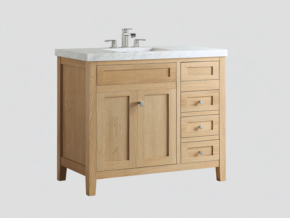Ce meuble sous vasque au style moderne associe une finition bois chêne clair à un plan en marbre blanc, apportant une atmosphère naturelle et élégante à votre salle de bain.
