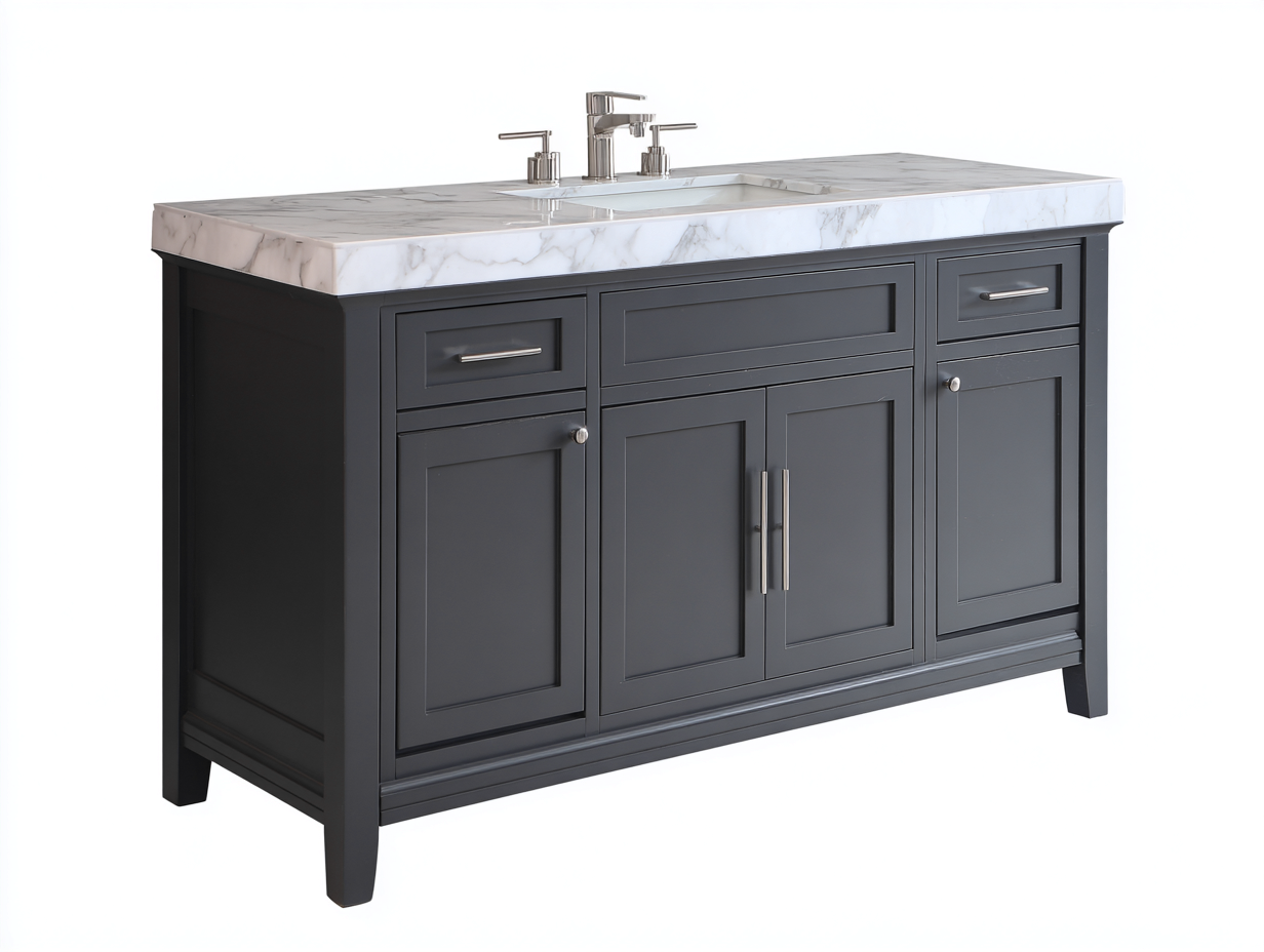 Ce meuble sous vasque au style moderne associe une finition gris foncé à un plan en marbre blanc, créant un contraste élégant adapté à une salle de bain contemporaine.