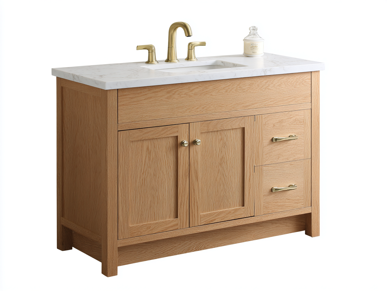 Ce meuble sous vasque au design moderne associe une structure en bois brun avec des éléments métalliques dorés et un plan en pierre, créant une ambiance élégante pour une salle de bain contemporaine.